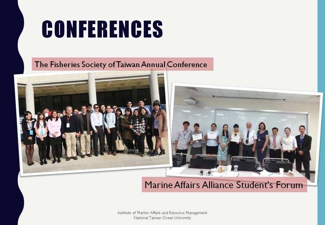 並於國內舉辦APEC海洋保護論壇,第二到四屆海洋與台灣研討會、水下文化資產研討會、海洋法政論壇、臺菲雙邊海洋事務交流會、漁業面對氣候變遷之衝擊與調適國際研討會
